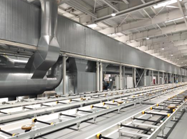 烘干室的作用是在一定的時間內(nèi)將漆膜和密封膠固化,使工件獲得可靠的漆膜質(zhì)量,同時便于后續(xù)作業(yè)。 烘干室分直通式、橋式、Π型烘干爐。烘干爐由室體(烘道)、循環(huán)風(fēng)管、加熱裝置、廢氣處理裝置(TAR或RTO設(shè)備)、風(fēng)幕及頂部熱頂裝置等部件組成。 直通式烘干爐加熱單元位于室體上方的平臺上,橋式烘干爐和Π型烘干爐加熱單元位于室體下方的地面上。