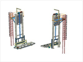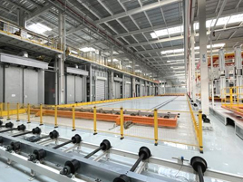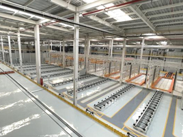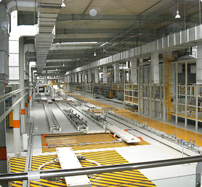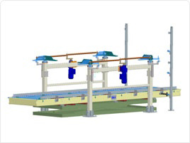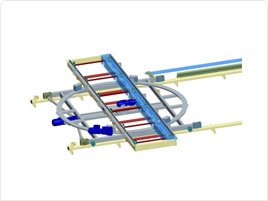 地面滑橇輸送系統(tǒng)由由滾床、高溫滾床、升降機(jī)、移行機(jī)、鏈?zhǔn)揭菩袡C(jī)、旋轉(zhuǎn)移行機(jī)、叉式移載升降機(jī)、單鏈(或雙鏈)輸送機(jī)、旋轉(zhuǎn)滾床、滑橇及堆/拆垛機(jī)等多單元組成。
