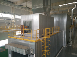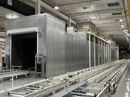 烘干室的作用是在一定的時間內(nèi)將漆膜和密封膠固化,使工件獲得可靠的漆膜質(zhì)量,同時便于后續(xù)作業(yè)。 烘干室分直通式、橋式、Π型烘干爐。烘干爐由室體(烘道)、循環(huán)風(fēng)管、加熱裝置、廢氣處理裝置(TAR或RTO設(shè)備)、風(fēng)幕及頂部熱頂裝置等部件組成。 直通式烘干爐加熱單元位于室體上方的平臺上,橋式烘干爐和Π型烘干爐加熱單元位于室體下方的地面上。