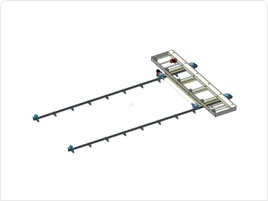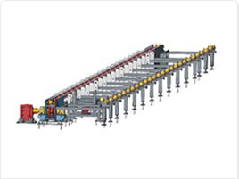 地面滑橇輸送系統(tǒng)由由滾床、高溫滾床、升降機(jī)、移行機(jī)、鏈?zhǔn)揭菩袡C(jī)、旋轉(zhuǎn)移行機(jī)、叉式移載升降機(jī)、單鏈(或雙鏈)輸送機(jī)、旋轉(zhuǎn)滾床、滑橇及堆/拆垛機(jī)等多單元組成。